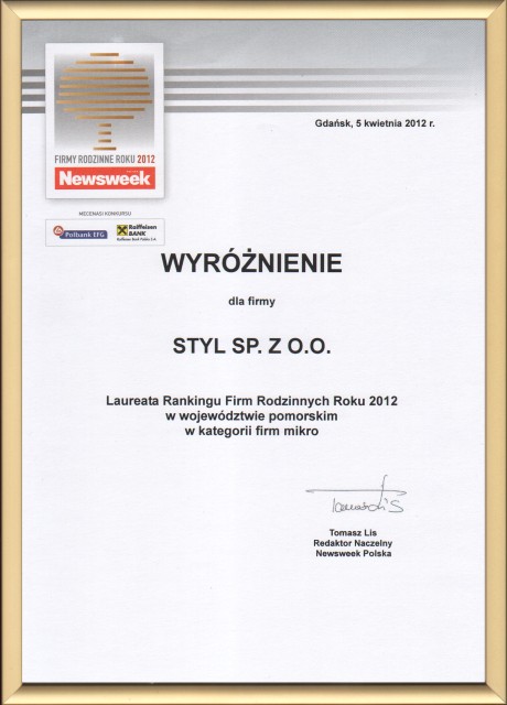 Otrzymaliśmy wyróżnienie w konkursie Firmy Rodzinne Roku 2012 Newsweeka